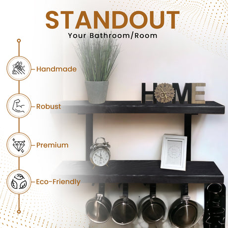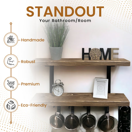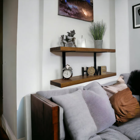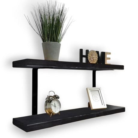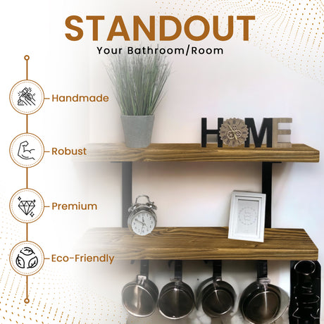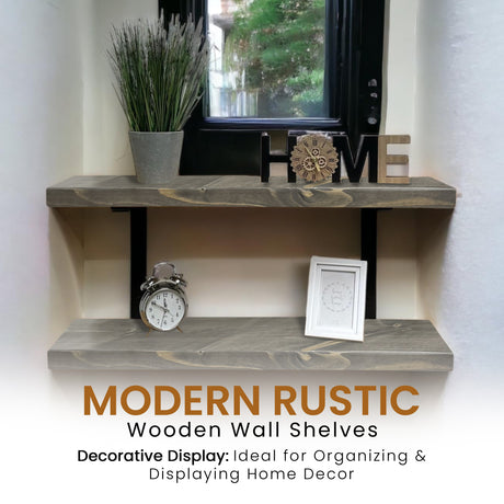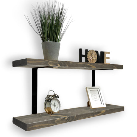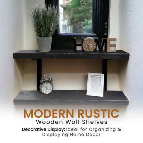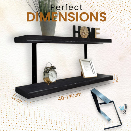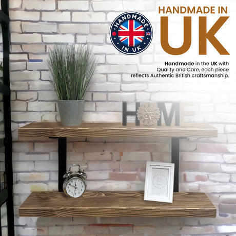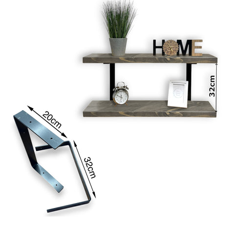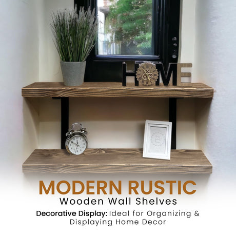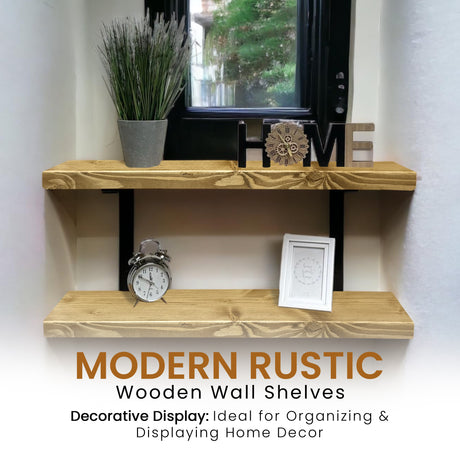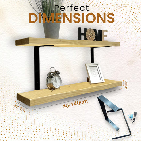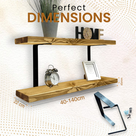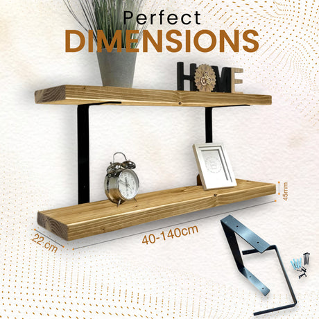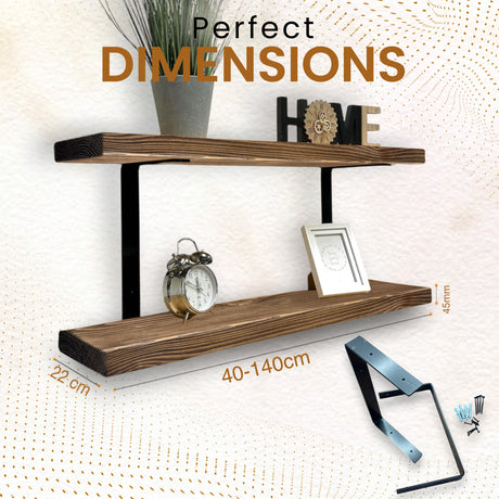 Set of 2 Rustic Shelves | Wall-Mounted Wooden Board With Double Brackets, 22cm Depth